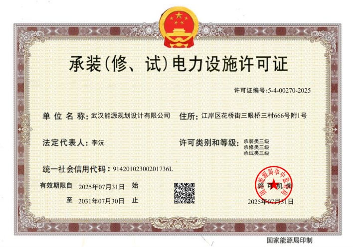 7月31日,武汉能源规划设计有限公司申报的承装(修、试)电力设施许可证书(三级)通过国家能源局华中监管局行政审批并取得许可证书。作为新修订的《承装(修、试)电力设施许可证管理办法》7月1日实施后首批获证企业,公司继2024年取得电力工程施工总承包贰级资质后,再次斩获电力工程相关施工资质,为布局电力行业施工业务、向设计咨询施工一体化转型发展奠定了基础。